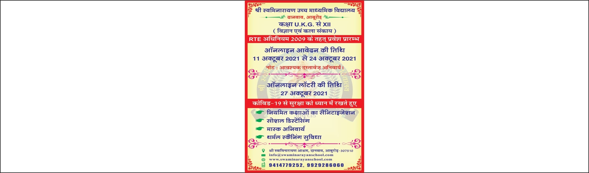 vjkoyh ioZrekyk dh euksje ouJh ds e/;] ekmUV jksM ij Jh Lokfeukjk;.k fo|ky; ds rhuksa laLFkk,Wa dk;Zjr gSA izkFkfed]mPp izkFkfed vkSjek/;fed foHkkx dk fodkl o"kZ 2011&12 esa lEiUu gqvkA rRi’pkr o"kZ 2012&13 ls fo|ky; esa mPp ek/;fed foHkkx tqM tkus ls dsoy ikap o"kZ ds varxZr Jh Lokfeukjk;.k fo|ky; d{kk ,y-ds-th ls ckjgoha rd dh laiw.kZ fo|k O;oLFkk ds :i esa mHkj vk;kA mPp ek/;fed esa foKku ,oa dyk ladk; miyC/k djk, x;s gSA vkcwjksM rglhy Lrj ij loZizFke lgf’k{kk ds lanHkZ esaa mPp ek/;fed fo|ky; esa foKku o dyk ladk; dk 'kqHkkjaHkA